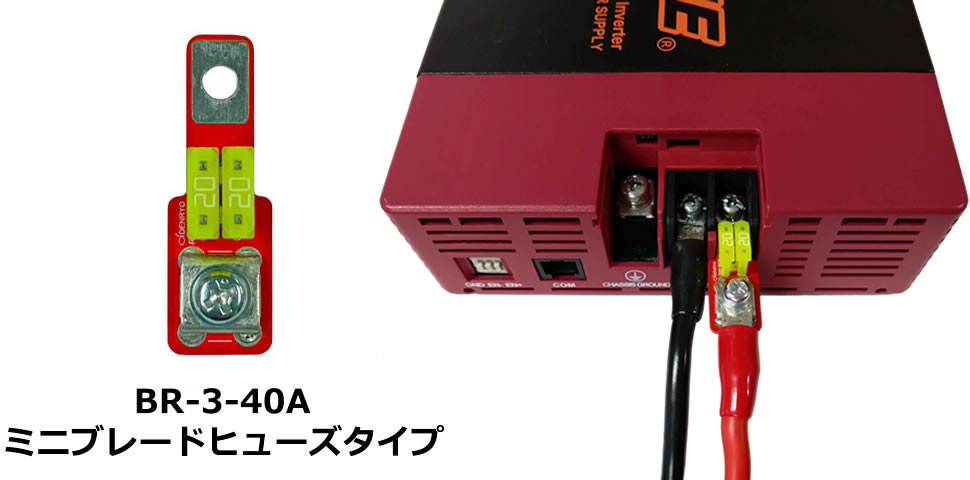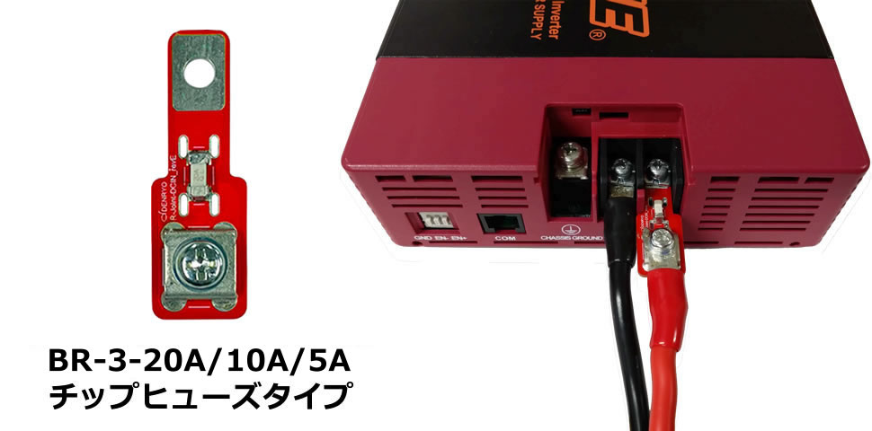 BR-3は、DIASINEⓇシリーズのバッテリー入力に接続することができるヒューズ付きのオプション端子です。(+)側か(-)側のいずれかに接続し、本製品を介してバッテリーと配線を行うことでDIASINEⓇシリーズ内部の回路を保護することができます※。ヒューズが切れている場合には、新たに本製品をご購入いただくことを推奨しております。